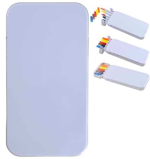 Colour/s   White case, Yellow, Orange highlight markers, Red, Black, Blue pens.