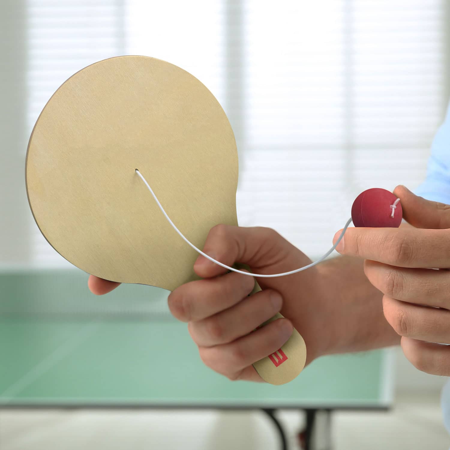 The nostalgic game of Paddle Ball features a small wooden paddle that has a rubber ball attached to its centre by an elastic string making it a great one player activity.