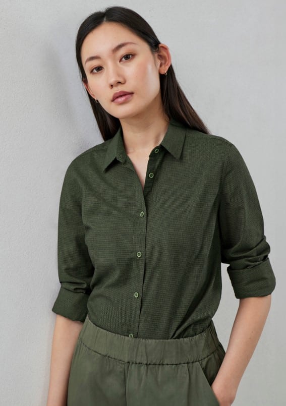 60% Cotton, 40% Recycled Polyester; Yarn-dyed Micro-check; 120 GSM; UPF Rating 15+
