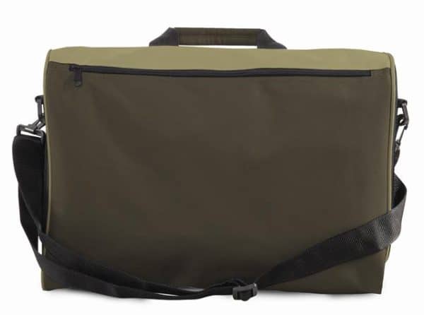 600D Polyester with PVC backing, single zippered compartment, small zippered internal pocket, business card holder & adjustable & detachable shoulder strap