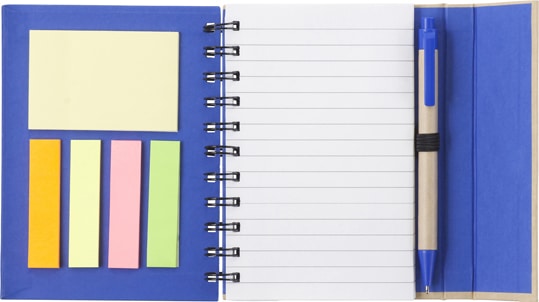 Wire bound notebook with a magnetic closure, contains one 7,5 x 5cm sticky note pads, four x 25 sheet page memos, a sixty page double sided lined note pad and a ballpen with black ink.