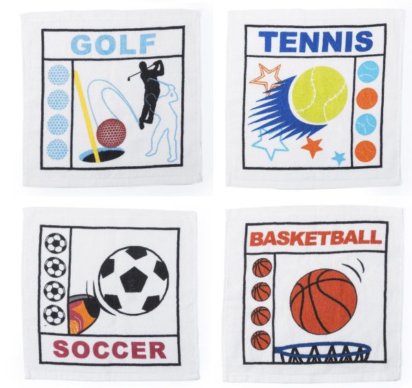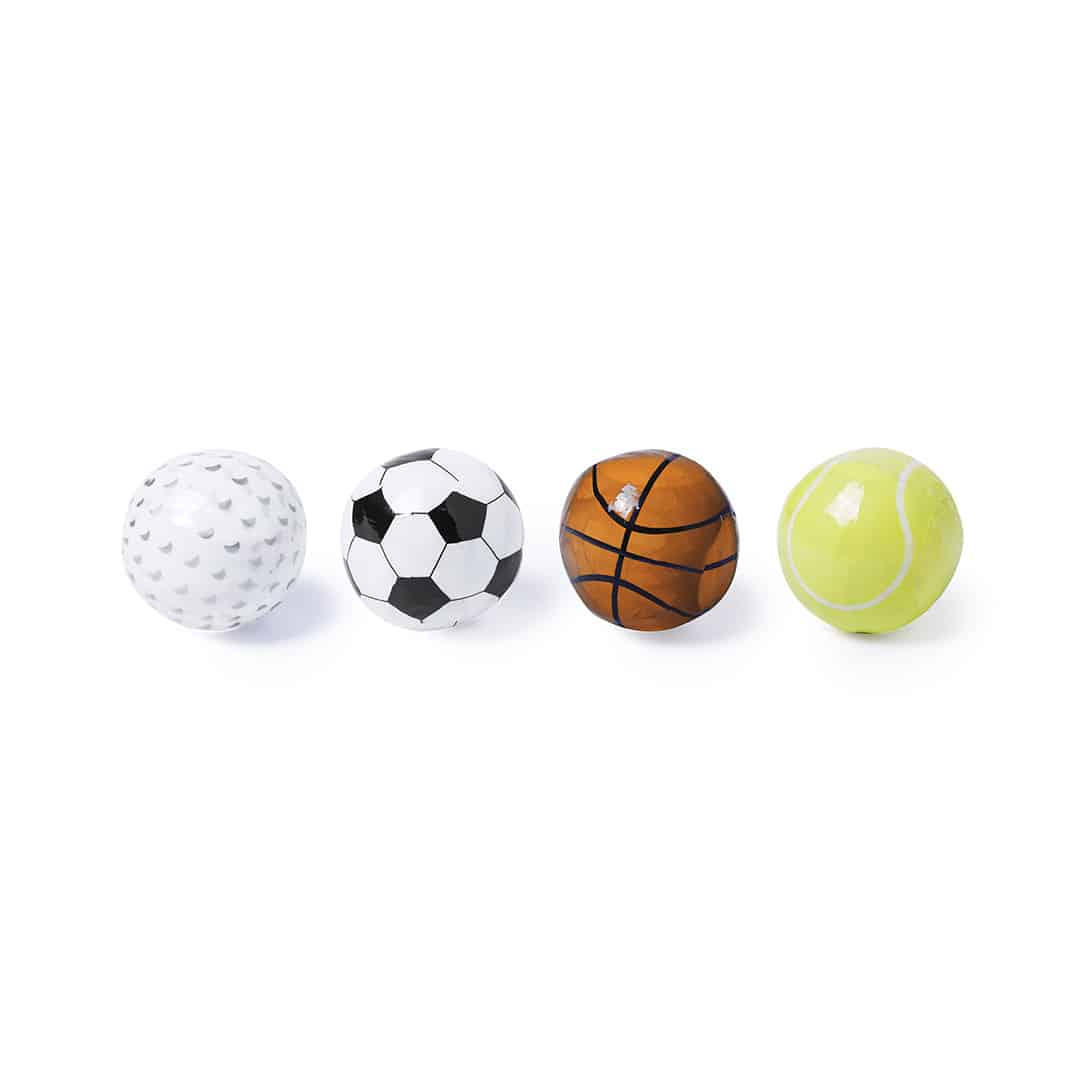 Folded inside a ball with football, basketball, tennis and golf designs.