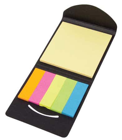 25 sheet sticky note pad and five coloured flags, with recycled cardboard cover