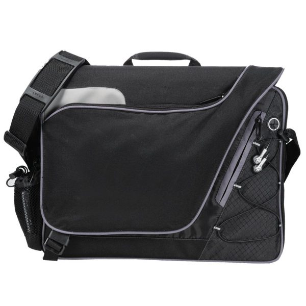| Main open compartment. Front zippered pocket and quick-access corner pocket and zippered accessory pocket. Front bungee cord. Adjustable shoulder strap. Rear trolley pass through. Made from 600D polycanvas. | |