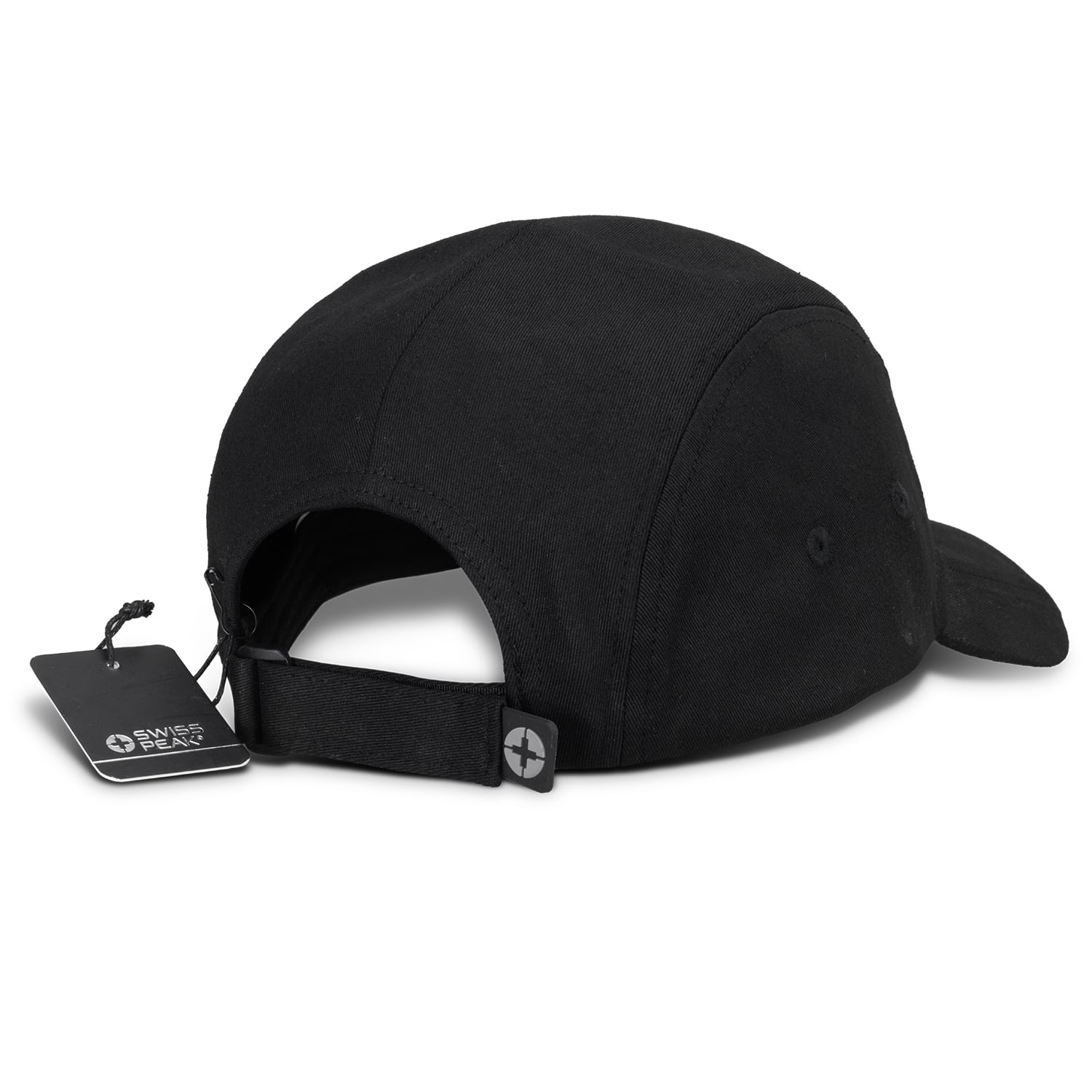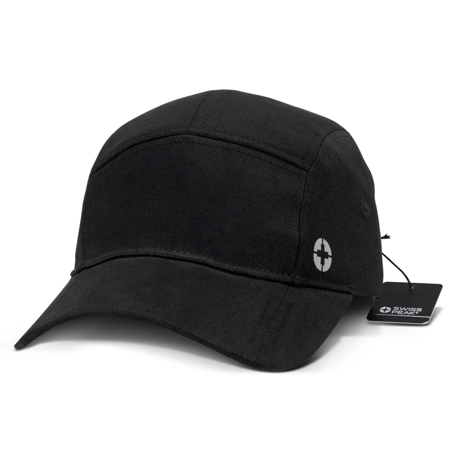 Swiss Peak’s deluxe five panel hat is made of a soft blend of 98% cotton and 2% spandex. The hat features an adjustable Velcro strap with a silicone pull tab, grey accents, and custom Swiss Peak bias tape interior. Available in one size to fit most people, the hat sports a reflective Swiss Peak logo and hang tag.