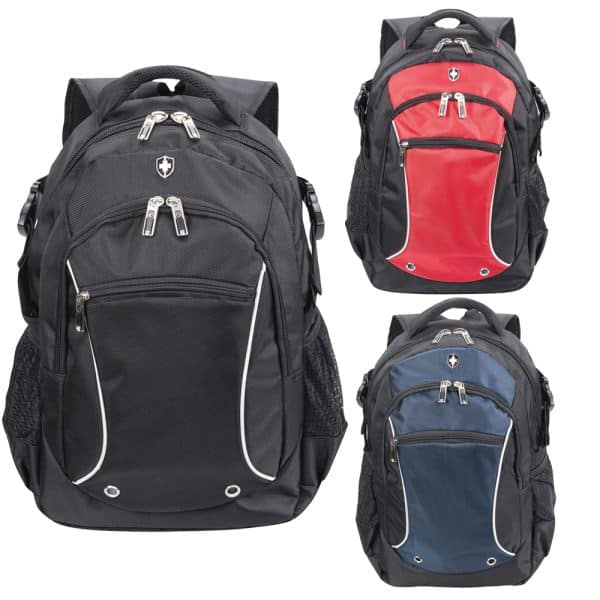 Outdoor backpack with laptop compartment. 1680D polyester with PU backing and trimmed in red and black jacquard polyester. Available in 3 colours.
