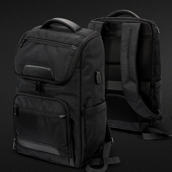 Make the daily commute easier and more stylish with the Swiss Peak Voyager Laptop Backpack. It is manufactured from premium 1680D polyester fabric with smart PU accents and 210D polyester lining. The large main compartment has a zip-around closure and includes a padded pocket that will comfortably hold a 15-inch laptop, two slip pockets that offer RIFD protection and a USB outlet. The back of the backpack is heavily padded for extra comfort and the padded shoulder straps are fully adjustable. Other features include two side pockets with elastic openings to hold water bottles and other accessories, three external zippered pockets, a padded carry handle and a rear luggage sleeve that slides over the handle of a rolling suitcase. The Swiss Peak logo is subtly debossed on the front of the bag and branded on the laptop pocket.