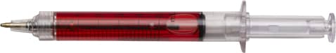 Syringe shaped plastic ballpen with coloured liquid, black ink.