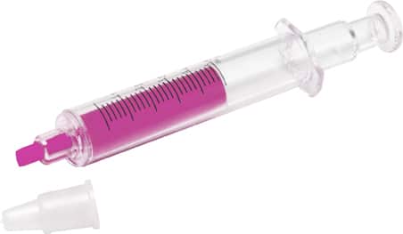 Syringe shaped plastic text marker available with yellow, pink, or pale green colouring.