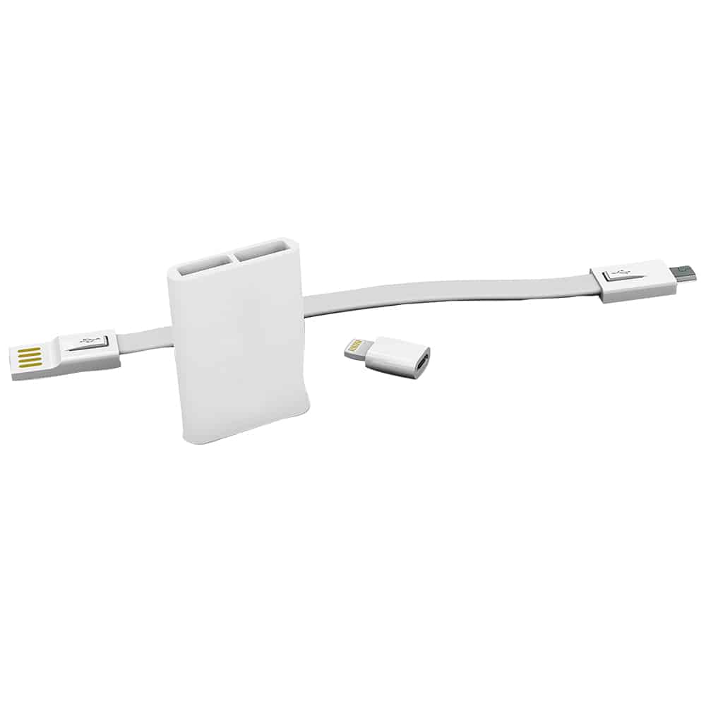 Emergency micro USB and lightening connectors. Cable specs: USB-Micro USB, charging and data transfer enabled.