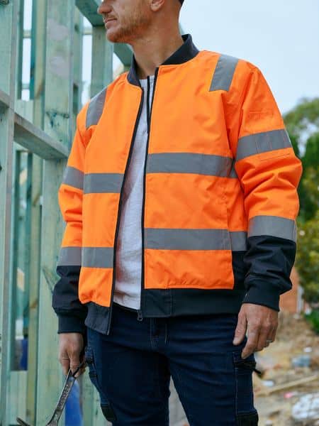 Reflective tape in hoop pattern around body with biomotion configuration on sleeves and over shoulder strip for optimal day/night visibility