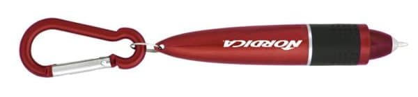 A pocket sized retractable ballpoint pen with a soft grip, a carabiner key chain and black ink.