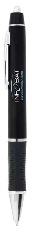 A click action ballpoint pen with black ink, a soft grip and a metal pocket clip.