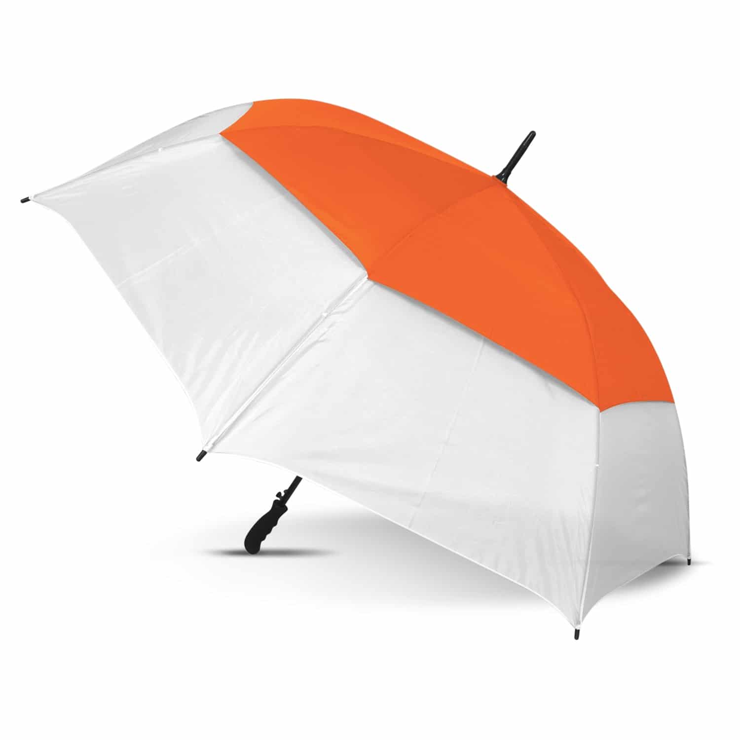 Superior automatic opening, eight-panel sports umbrella. It has a vented, twin-panel showerproof and windproof 190T polyester canopy with 76cm ribs. Trident has an eight-rib fibreglass frame and a strong fibreglass shaft. Other features include a contoured soft-touch hand grip, plastic tips, two Velcro ties and the option of full colour branding on the white panels.