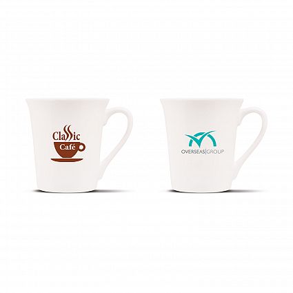Round, latte style 300ml D handle stoneware coffee mug presented in a Black gift box. The branding options available are dishwasher safe