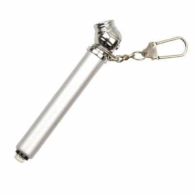 Metallic barrel with silver head and keychain. When the tyre gauge is attached a measure drops down at the other end. Polybagged.