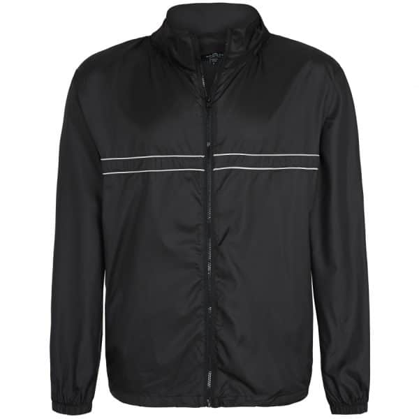 Ripstop jacket than folds into its own pocket. DWR treatment on outer fabric. Set in sleeves. Contrast piping detail across chest. 2 front zippered hand pockets. Adjustable elastic cord at hem. Packable hood concealed in collar.