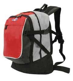 900D polyester/420D nylon Front Pocket Backpack with porthole for headphones, zippered front pocket, adjustable waist and chest straps