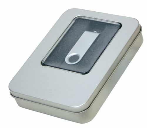 Fully compliant with USB version 2.0, satin metal finish with black rubber trim. Packed in tin box.