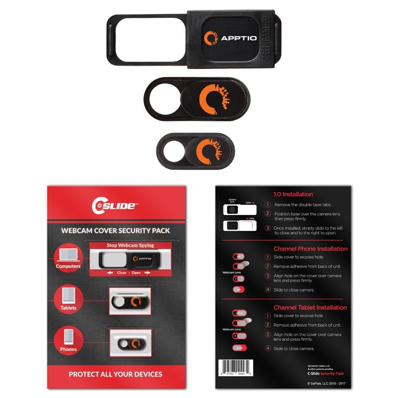 The Webcam Security 3 Pack provides the ultimate privacy protection against webcam hackers while offering a high impression branding area. This pack includes Webcam Cover Slide 1.0, Channel Tablet and Channel Phone all packed in one convenient package. Compatible with computer, laptops, tablets and smart phones. Simply peel off the rear liner to expose the 3M double-sided adhesive that works with all devices. Includes standard backing card with instructions or custom designed cards (see pricing). Material: ABS.