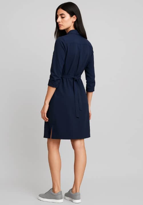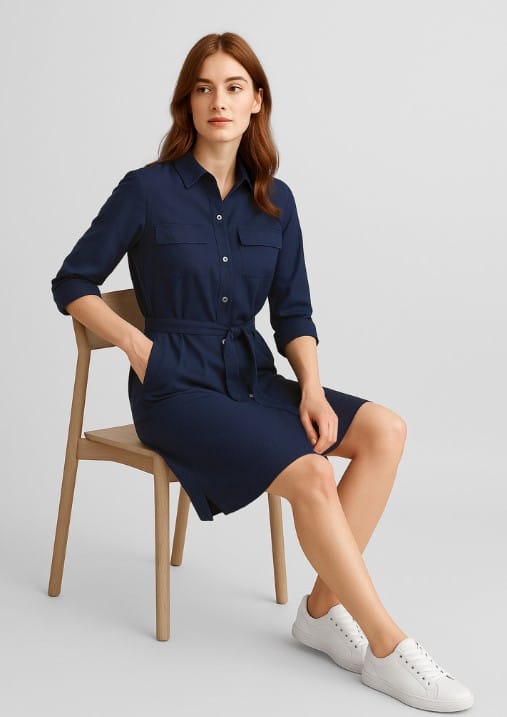 Both office and off-duty dress codes are covered with our chic shirt dress. With side pockets, secret bust button, detachable belt and side splits.