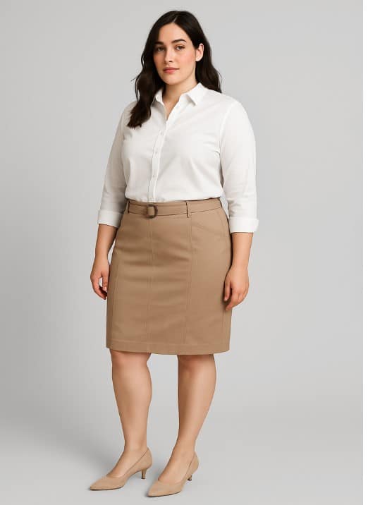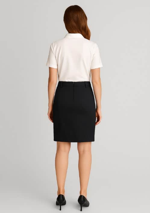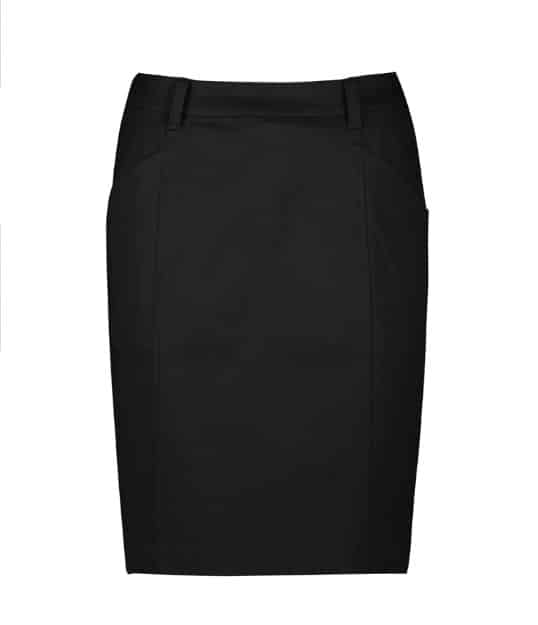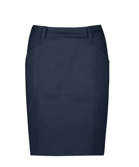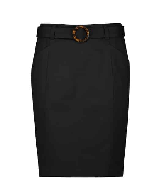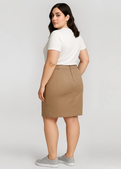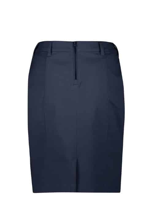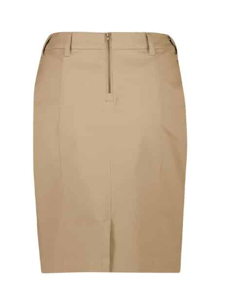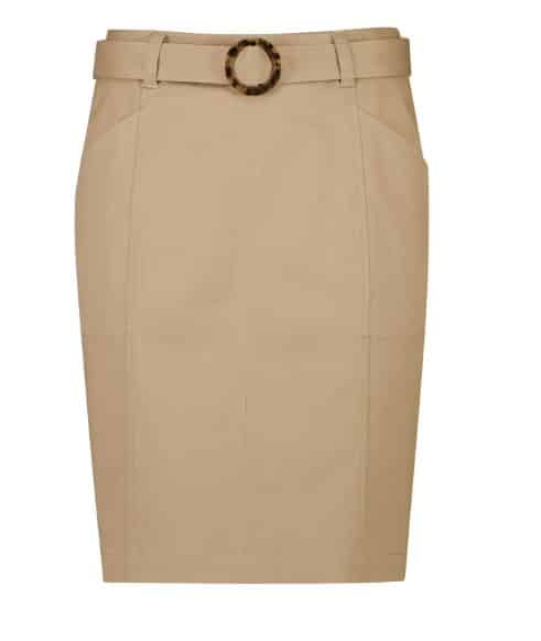 A modern Chino skirt featuring functional back split, non-gaping side seam pockets, metallic back zip feature, belt loops and modern trims. Pencil shape designed to finish mid length, but will vary depending on wearers height. Detachable belt included. Fabric has added stretch for comfort and easy movement.