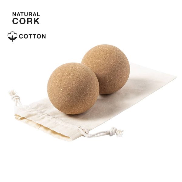 Nature line set of 2 balls for yoga and other activities. Made of resistant, natural cork and presented in a cotton bag with drawstring closure. With exercises illustrations