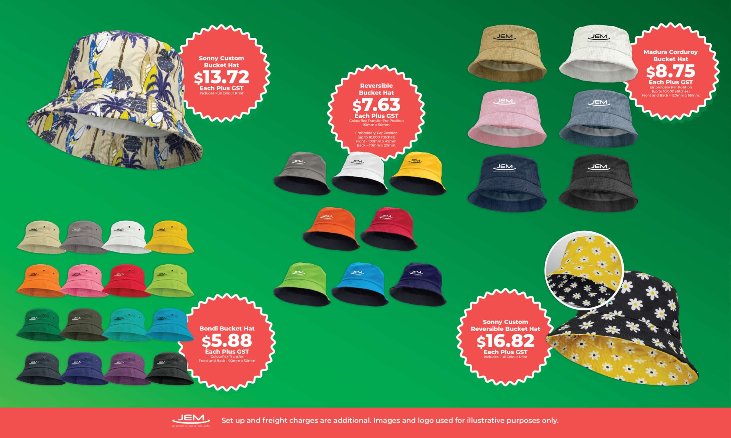 We love new promotional products at JEM so we can’t wait to share with you new and interesting merchandise items that are trending right now. Get ahead of the rest with exciting merchandise items for the change of seasons and as the warm weather comes along. Select from cool items such as the Chrysler Custom Flat Peak Cap, the Sonny Custom Bucket Hat, the Full Colour Compact Umbrella, the Full Colour Golf Umbrella, the Cotton Cooler Bag, the Canvas Backpack and the Mountaineer Bottle.